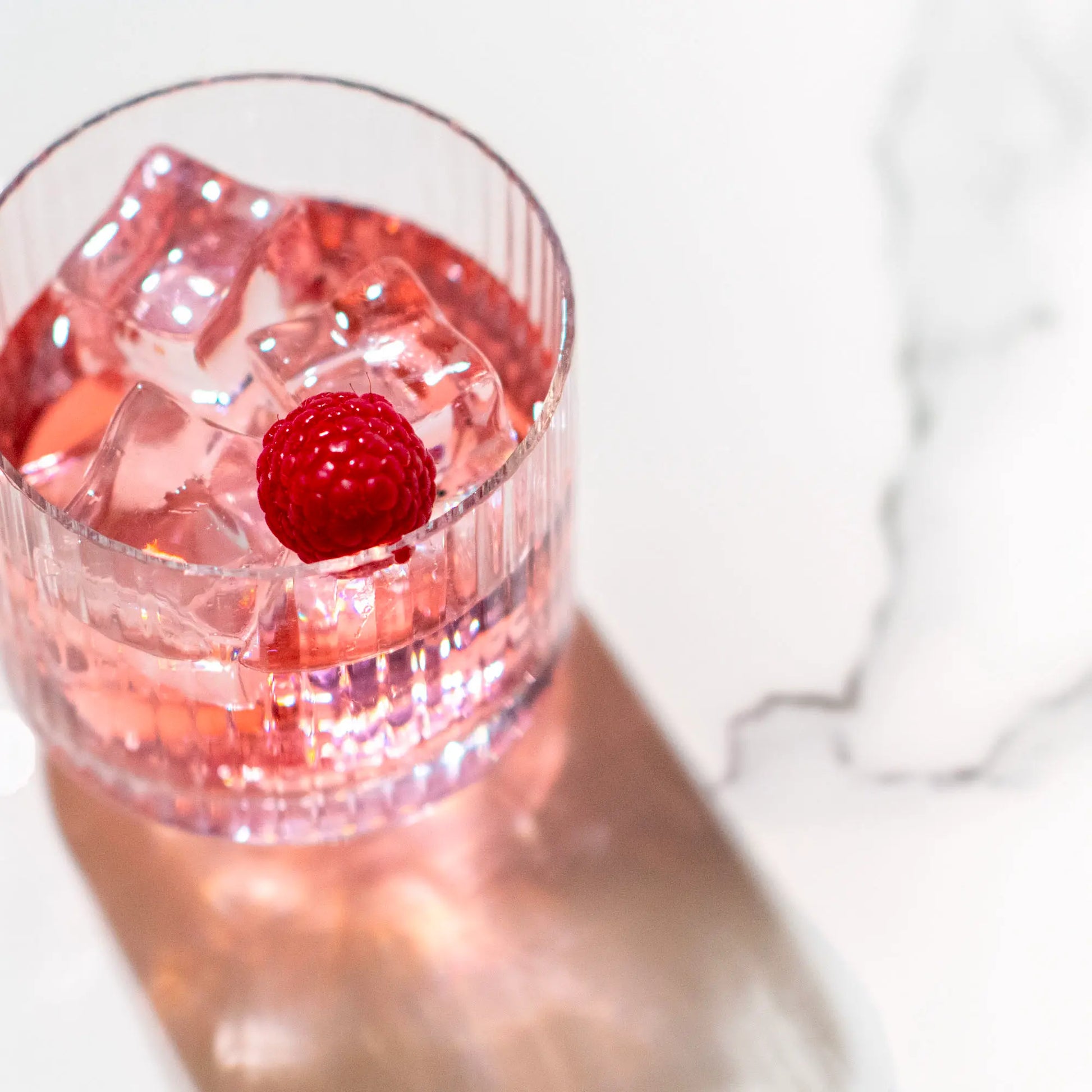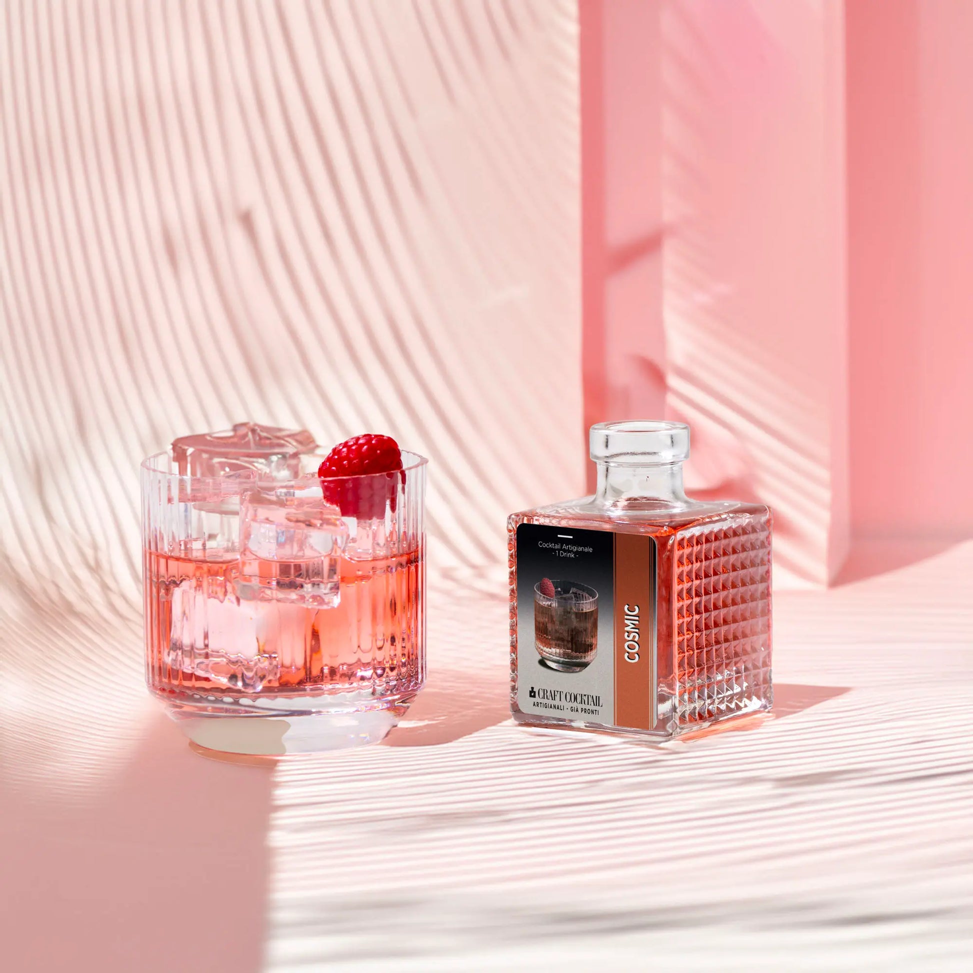 Versa il contenuto della bottiglia in un bicchiere colmo di ghiaccio, mescola dolcemente fino a raggiungere temperatura e diluizione gradite, guarnisci con un lampone.