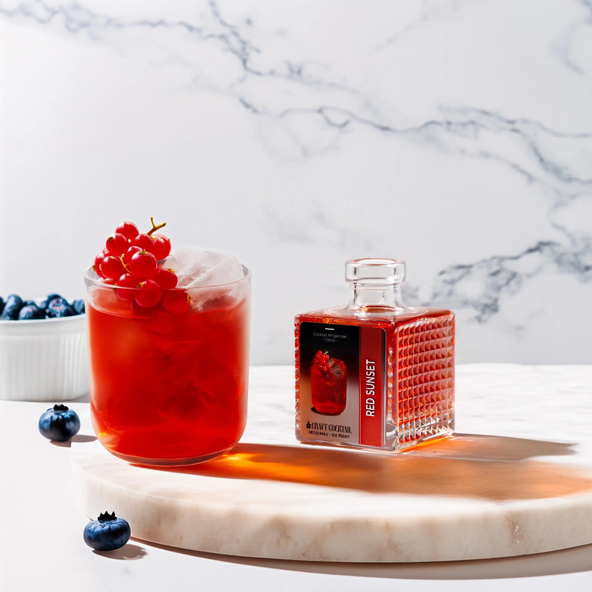 Versa il contenuto della bottiglia in un bicchiere colmo di ghiaccio, mescola dolcemente fino al raggiungimento di temperatura e diluizione gradite, guarnisci con un un mirtillo o un'amarena.