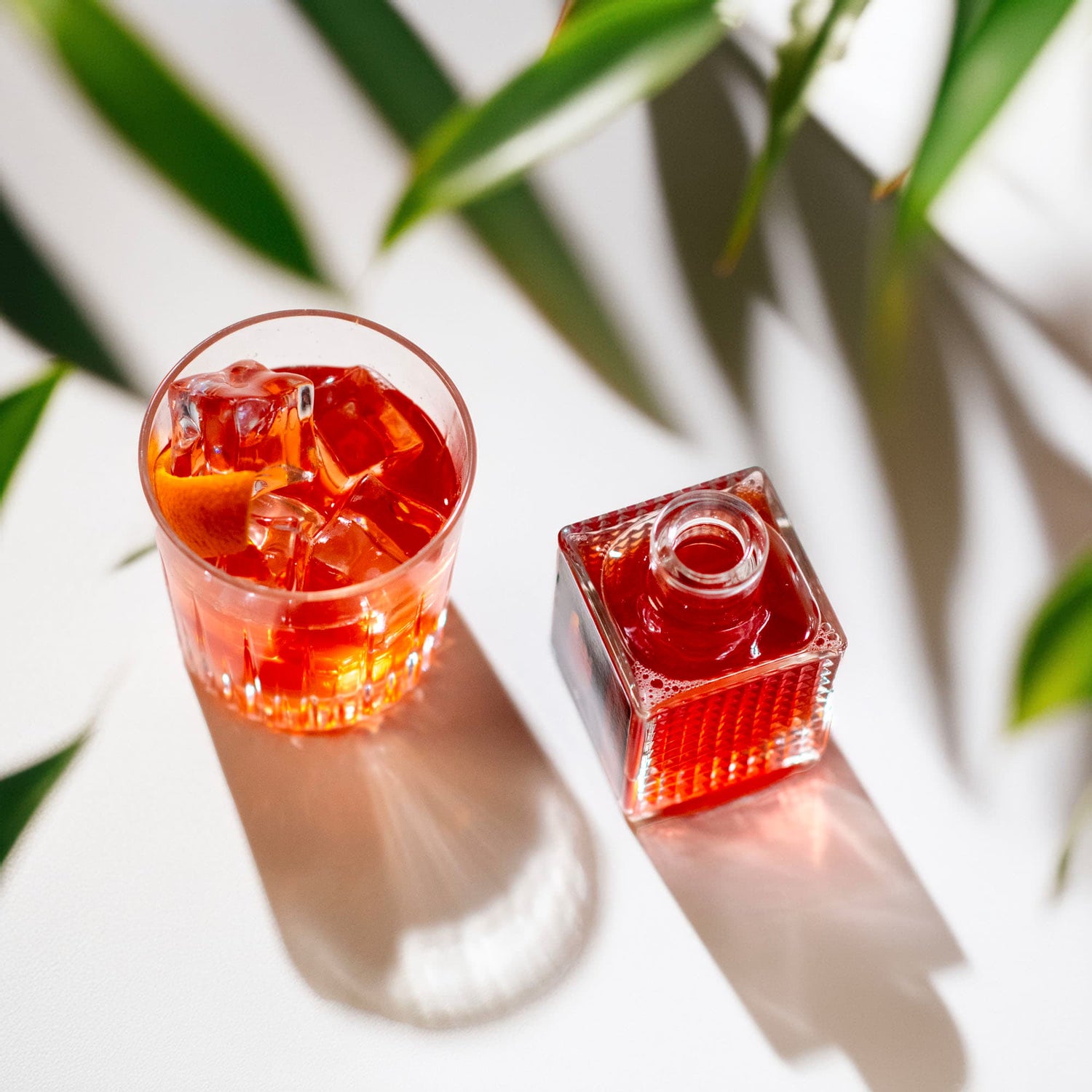 Versa il contenuto della bottiglia in un bicchiere colmo di ghiaccio, mescola dolcemente fino al raggiungimento di temperatura e diluizione gradite, guarnisci con una fetta d’arancia e un ciuffo di menta.